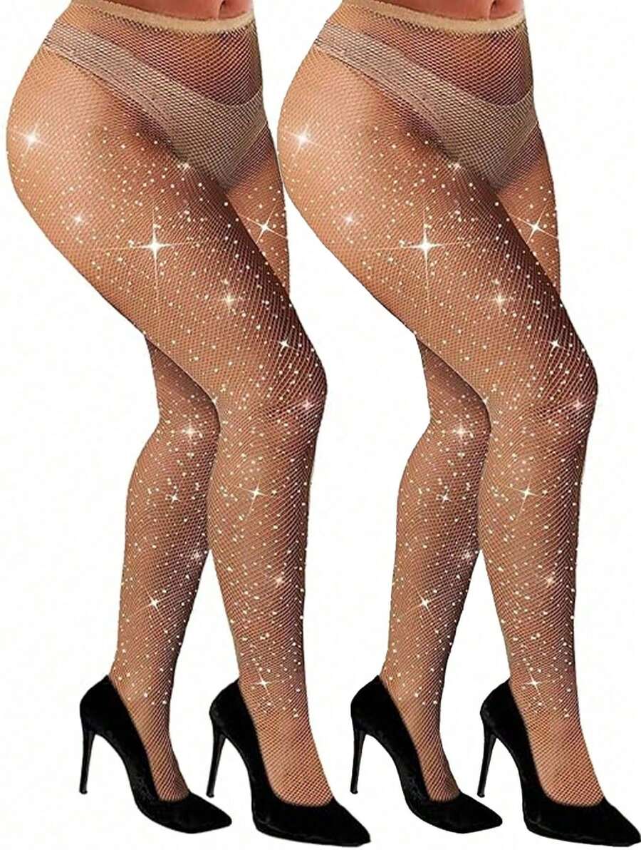 2 pièces Collants résille abricot ornés de strass pour femmes grandes tailles, bas résille skinny stretch, tenue de soirée brillante, mode gothique, polyvalent pour toutes les saisons