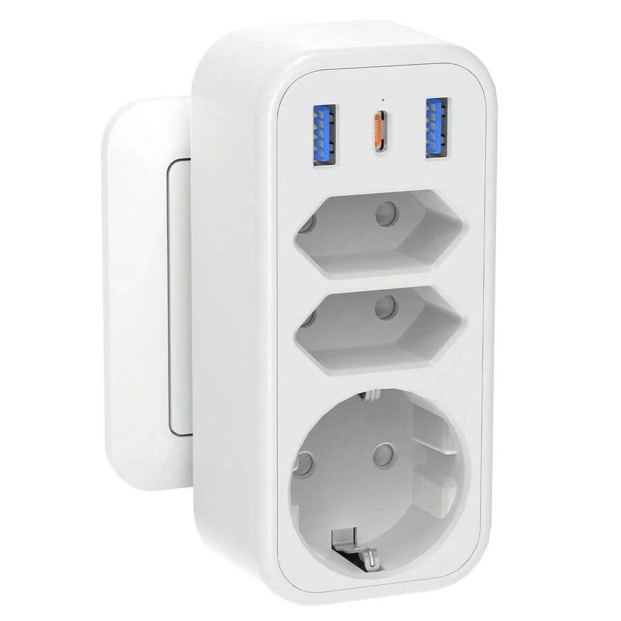 Multiprise 6-en-1 avec 3 prises AC, adaptateur de voyage 4000W/16A avec port de charge rapide USB-C PD 20W, noir blanc