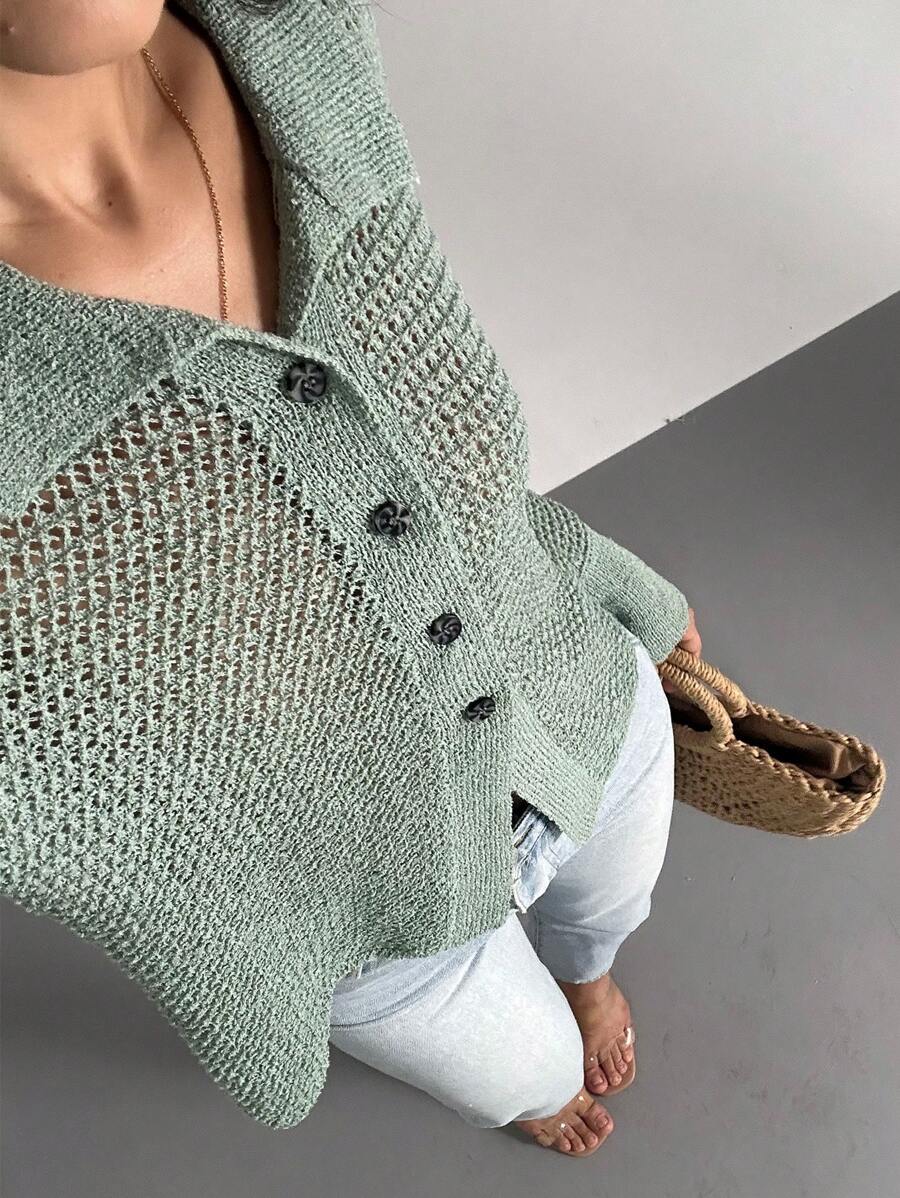 Se-Hore Mode Décontractée Cardigan Tricoté à Col Polo Manches Longues Ajouré, Polyvalent Pour Trajets Quotidiens/Rétro Américain/Loisirs Confortables, Automne